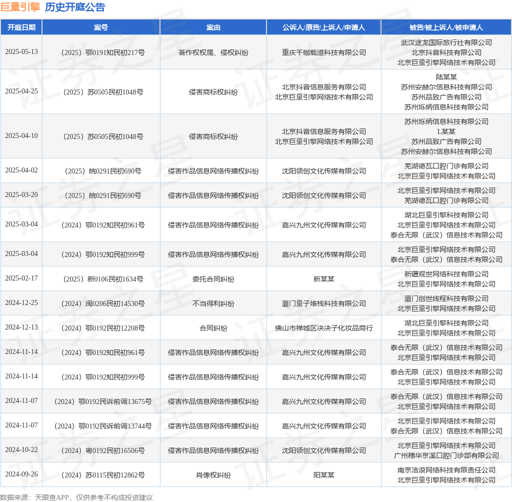案号:(2025)鄂0191知民初217号审理法院:武汉经济技术开发区人民法院案由:著作权权属、侵权纠纷当事人信息: 原告/上诉人:重庆千咖载道科技有限公司 被告/被上诉人:武汉途龙国际旅行社有限公司、北京抖音科技有限公司、北京巨量引擎网络技术有限公司开庭日期:2025年5月13日根据统计,近一年内以北京巨量引擎网络技术有限公司为当事人的历史开庭公告有16则,其中案由为“侵害作品信息网络传播权纠纷”的公告以9则居首,其次为“侵害商标权纠纷”有2则,“不当得利纠纷”有1则。历史开庭公告如下: